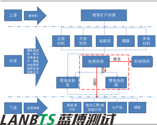 鋰離子電池制造是指把各種鋰電池材料組合起來形成電芯,具有技術(shù)壁壘高、資金投入大的特性,國際大廠如三星集團(tuán)、索尼、 LG 化學(xué)、 ATL 為行業(yè)領(lǐng)軍者,國內(nèi)的比亞迪、天津力神、比克占有一定的市場份額。鋰離子電池組裝是指把若干電芯組裝形成鋰電池組,主要組裝廠家分布于中國臺(tái)灣、大陸以及日本、韓國等區(qū)域。鋰離子電池檢測(cè)和測(cè)試是鋰電池制造和組裝必不可少的環(huán)節(jié),是鋰電池性能實(shí)現(xiàn)和安全可靠使用的有力保障。電池測(cè)試系統(tǒng)國際品牌主要有:德國迪卡龍Digatron、美國必測(cè)BITRODE、美國MACCOR、美國阿濱Arbin等;國內(nèi)主要品牌有:深圳新威、深圳恒翼能、深圳瑞能RePower、湖北藍(lán)博LANBTS、武漢藍(lán)博RAMBTS、寧波拜特NBT等廠家。